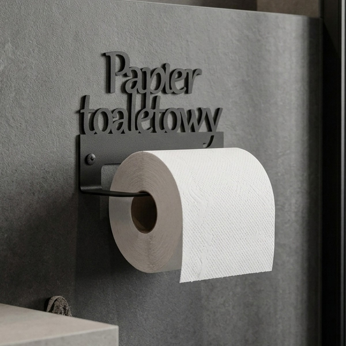 Uchwyt na papier toaletowy wycięty laserowo z metalu. Dostępny w różnych kolorach.
