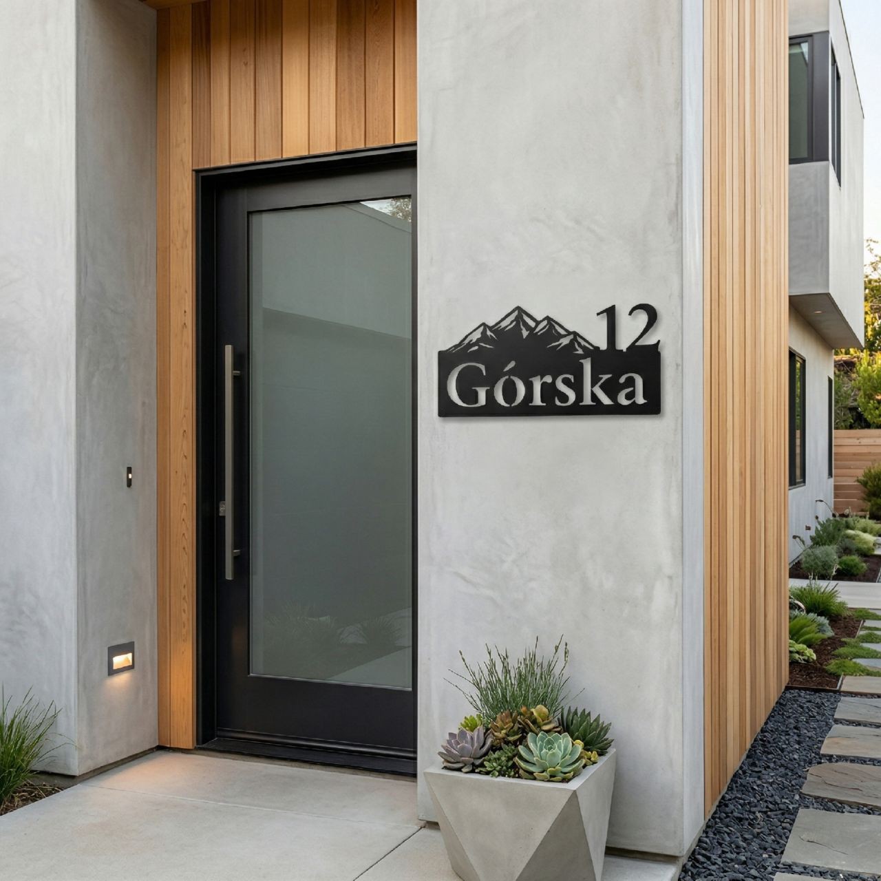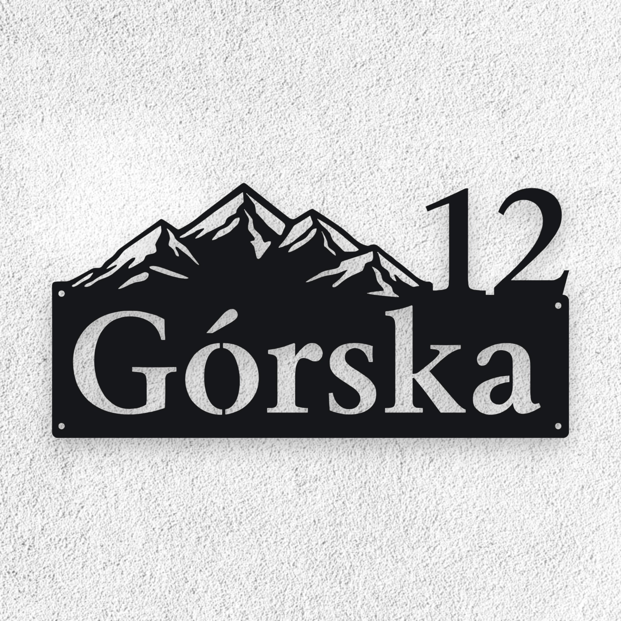 Nazwa „Górska” przywołuje obrazy majestatycznych szczytów, stromych grani, gęstych świerkowych lasów i krętych szlaków turystycznych. Dlatego stworzyliśmy delikatny, ażurowy motyw, w którym centralne miejsce zajmują stylizowane, ostre szczyty górskie. Tabliczka prezentuje się rewelacyjnie zarówno przy nowoczesnych domach, jak i przy klasycznych, zadbanych posesjach.