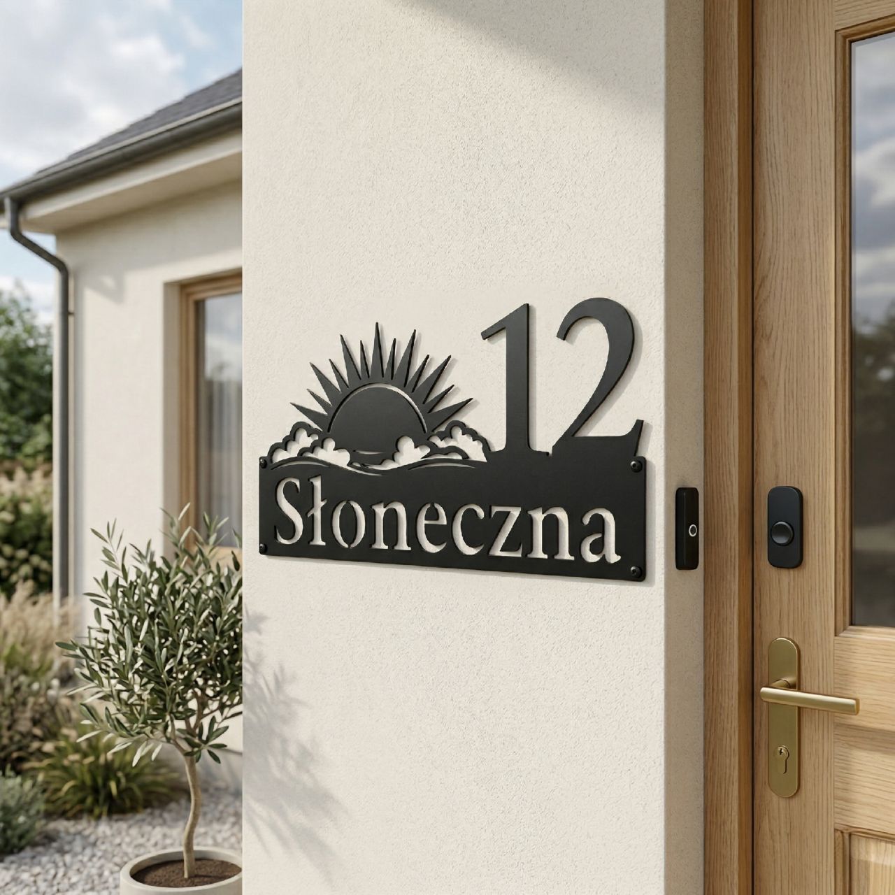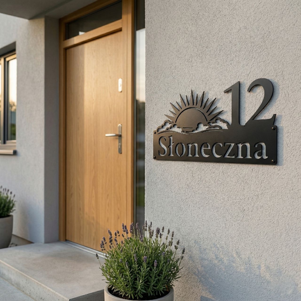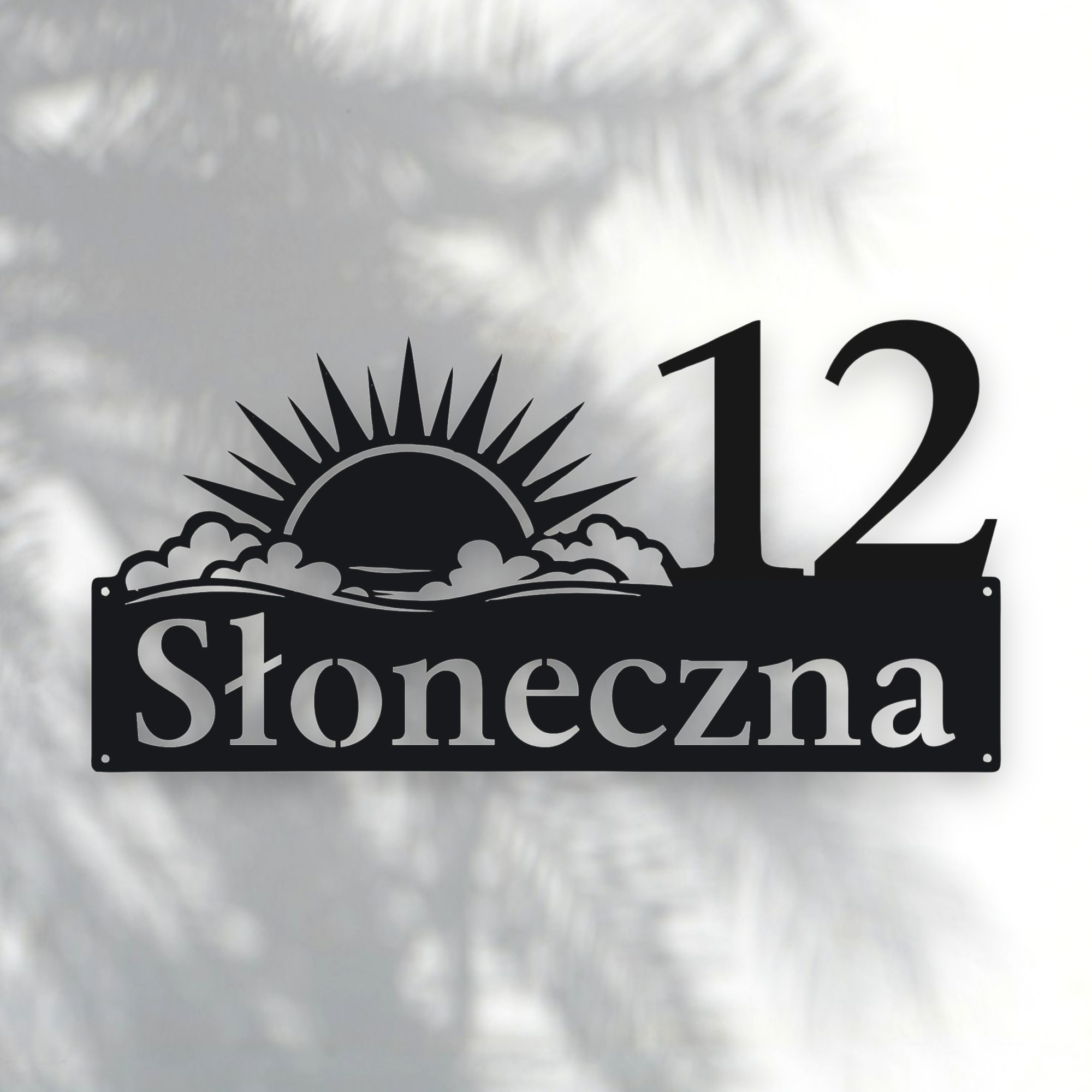 Nazwa „Słoneczna” kojarzy się z jasnością, ciepłem i optymizmem. Dlatego stworzyliśmy subtelny motyw składający się z delikatnych promieni słońca wychodzącego zza chmur. Każdy detal jest wycinany laserowo z milimetrową dokładnością. Motyw nie przytłacza numeru ani nazwy ulicy, lecz pięknie go otacza, dodając elewacji lub ogrodzeniu radosnego, słonecznego charakteru. Tabliczka prezentuje się rewelacyjnie zarówno przy nowoczesnych domach, jak i przy klasycznych, zadbanych posesjach.