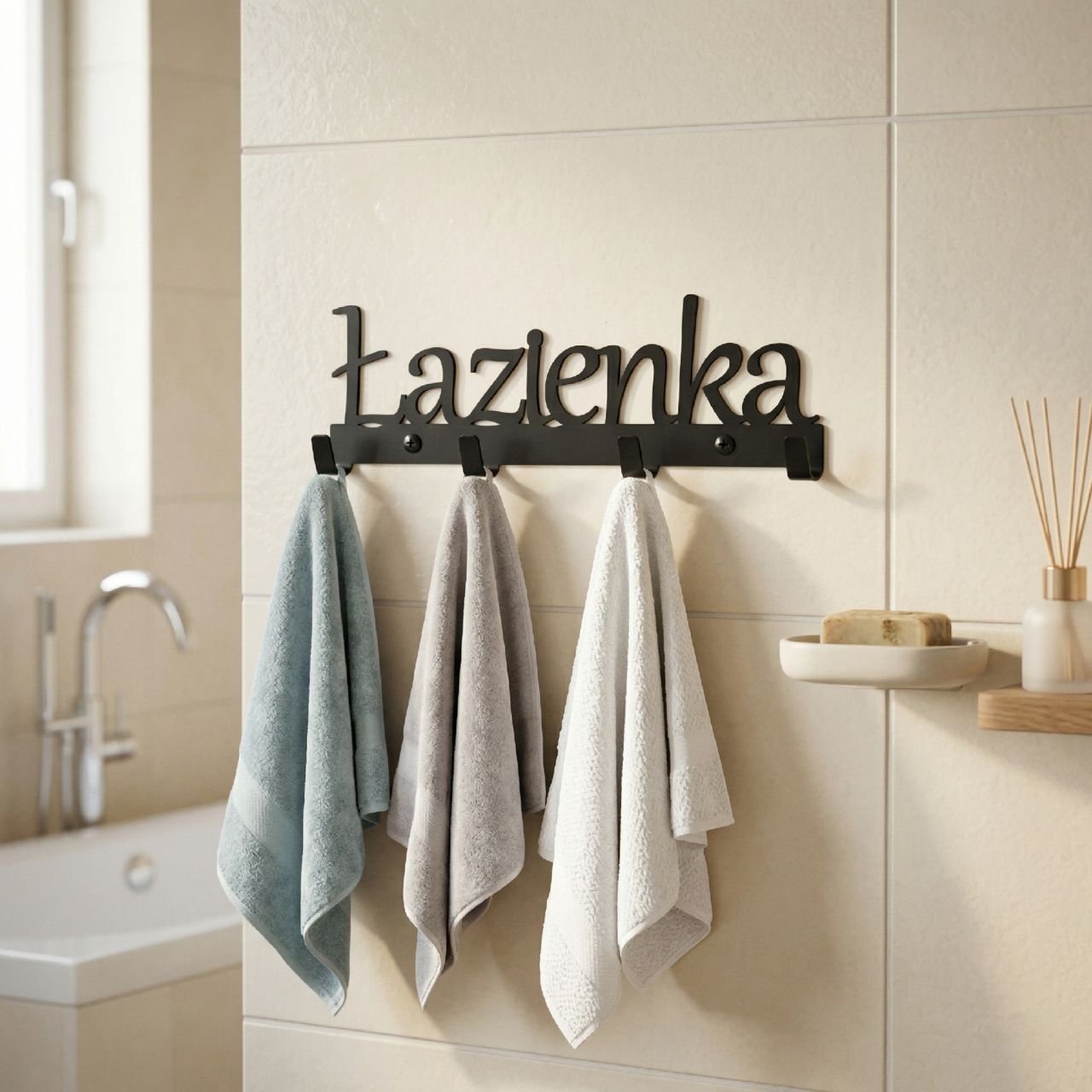 Wieszak do łazienki „Łazienka” to wycinany laserowo z metalu to elegancki i trwały dodatek do każdego pomieszczenia. Wysoka jakość materiałów gwarantuje, że wieszak jest odporny na uszkodzenia i zarysowania. Dzięki mocnym haczykom jest idealny do wieszania na nim ciężkich ręczników. Elegancki i minimalistyczny design doskonale wpasuje się w każdą aranżację wnętrza. Znajomi będą nim zachwyceni – sprawdzone niejednokrotnie wśród naszych klientów.