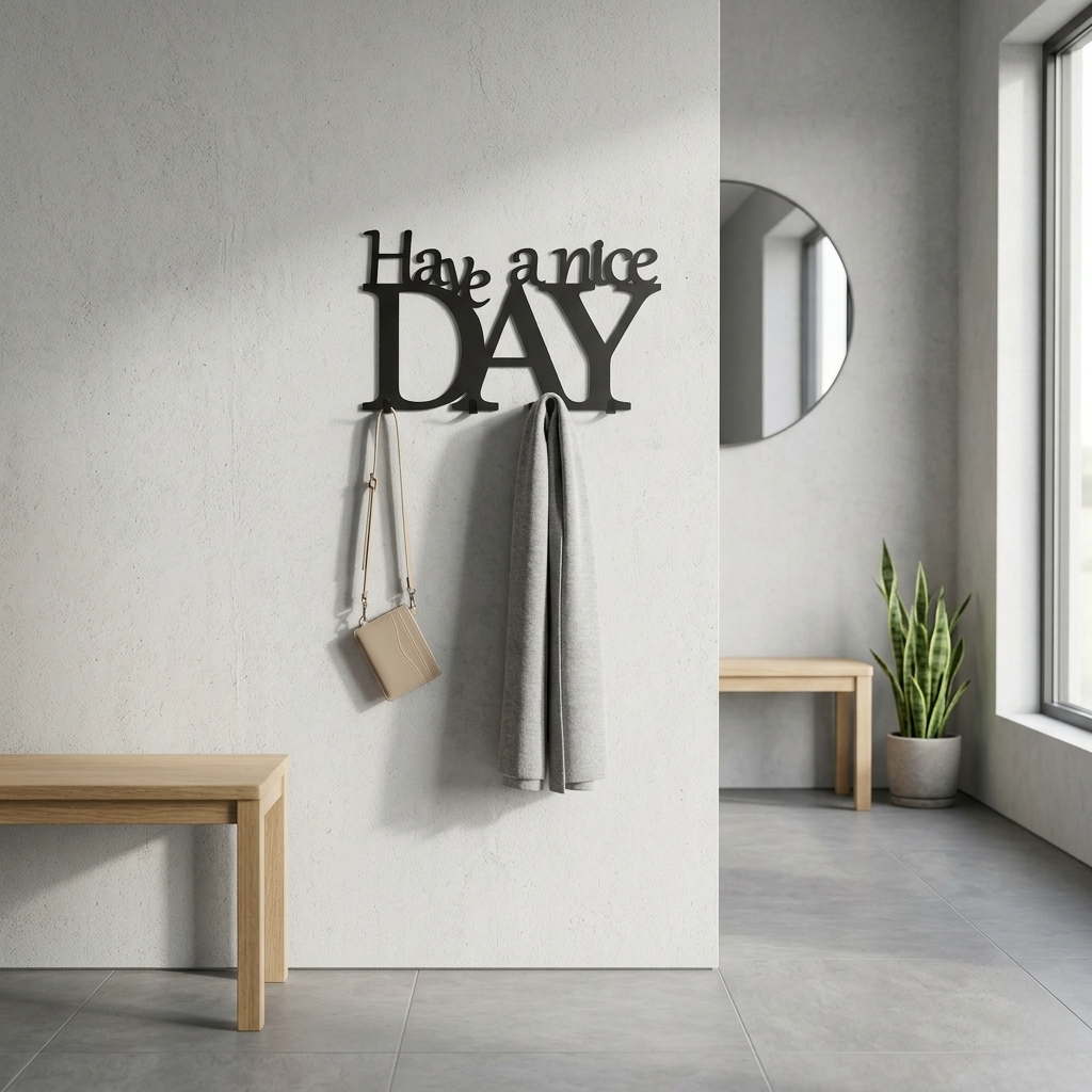 Wieszak na ścianę Have a nice day wycinany laserowo z metalu to elegancki i trwały dodatek do przedpokoju. Wysoka jakość materiałów gwarantuje, że wieszak ścienny jest odporny na uszkodzenia i zarysowania. Dzięki mocnym haczykom jest idealny do przechowywania ciężkich ubrań i dodatków jak kurtki, płaszcze, torby czy szaliki. Elegancki i minimalistyczny design doskonale wpasuje się w każdą aranżację wnętrza. Znajomi będą nim zachwyceni – sprawdzone niejednokrotnie wśród naszych klientów.