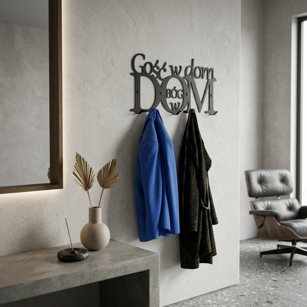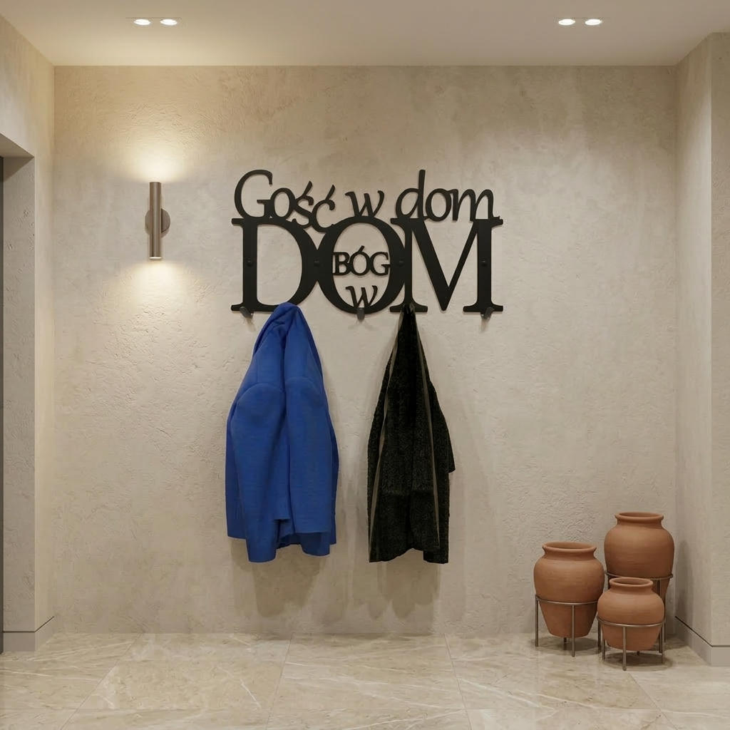 Każdy wieszak na ścianę Gość w dom Bóg w dom jest precyzyjnie wycinany laserowo z wysokiej jakości metalu o grubości 2mm (4x grubszy od karoserii samochodowej, która ma ok. 0,5mm grubości), co zapewnia perfekcyjne odwzorowanie liter i detali dekoracyjnych. Technologia cięcia laserowego gwarantuje niezwykłą dokładność, dzięki czemu napis jest wyraźny, estetyczny i dopracowany w każdym szczególe. Następnie wieszak jest wykończony metodą malowania proszkowego, która nadaje mu gładką, elegancką powierzchnię i zapewnia wyjątkową trwałość. Powłoka proszkowa chroni przed zarysowaniami, korozją i blaknięciem kolorów, dzięki czemu wieszak na kurtki zachowuje swój piękny wygląd przez długie lata, nawet przy intensywnym użytkowaniu.
