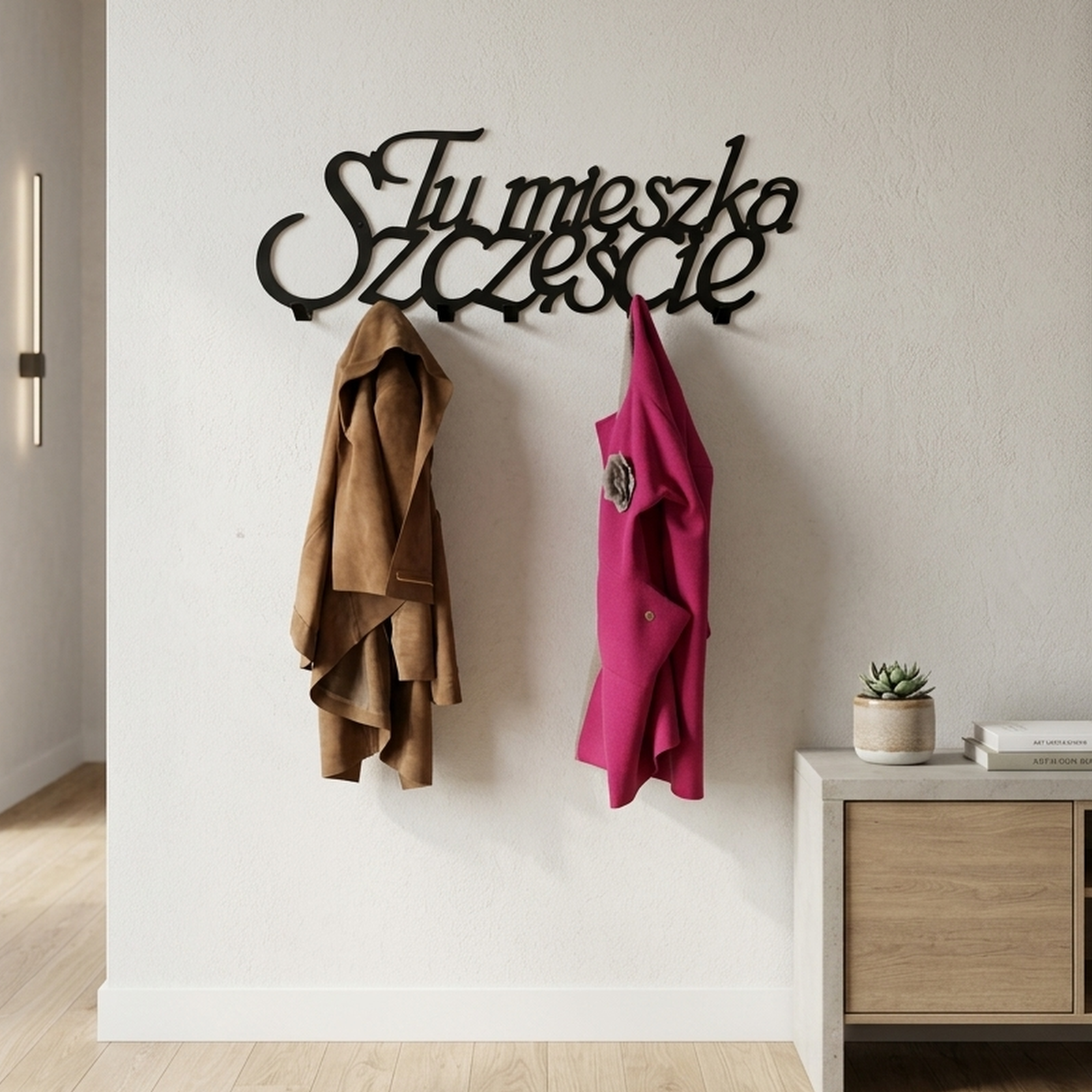 Każdy wieszak na ścianę Tu mieszka szczęście jest precyzyjnie wycinany laserowo z wysokiej jakości metalu o grubości 2mm (4x grubszy od karoserii samochodowej, która ma ok. 0,5mm grubości), co zapewnia perfekcyjne odwzorowanie liter i detali dekoracyjnych. Technologia cięcia laserowego gwarantuje niezwykłą dokładność, dzięki czemu napis jest wyraźny, estetyczny i dopracowany w każdym szczególe. Następnie wieszak jest wykończony metodą malowania proszkowego, która nadaje mu gładką, elegancką powierzchnię i zapewnia wyjątkową trwałość. Powłoka proszkowa chroni przed zarysowaniami, korozją i blaknięciem kolorów, dzięki czemu wieszak na kurtki zachowuje swój piękny wygląd przez długie lata, nawet przy intensywnym użytkowaniu.
