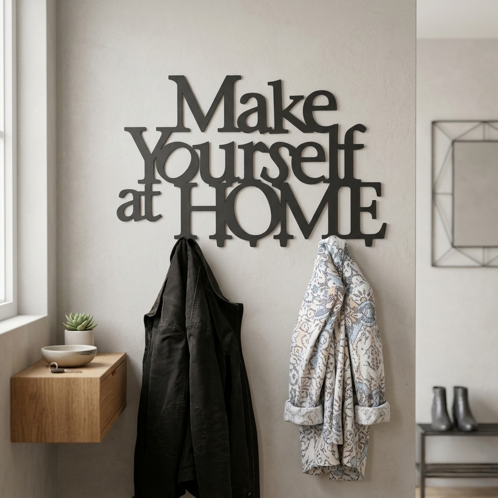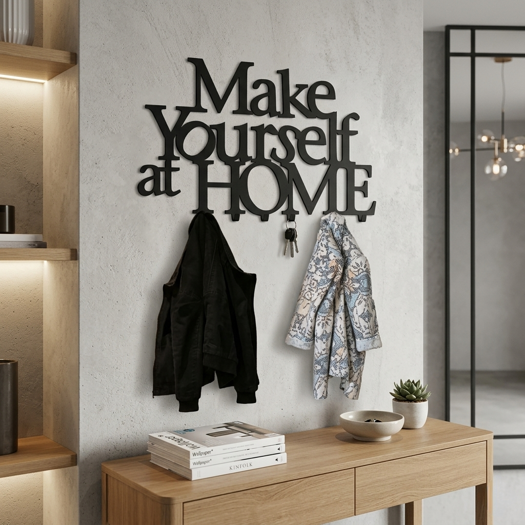 Wieszak na ubrania Make yourself at Home to wycinany laserowo z metalu to elegancki i trwały dodatek do każdego pomieszczenia. Wysoka jakość materiałów gwarantuje, że wieszak jest odporny na uszkodzenia i zarysowania. Dzięki mocnym haczykom jest idealny do przechowywania ciężkich ubrań i dodatków jak kurtki, płaszcze, torby czy szaliki. Elegancki i minimalistyczny design doskonale wpasuje się w każdą aranżację wnętrza. Znajomi będą nim zachwyceni – sprawdzone niejednokrotnie wśród naszych klientów.