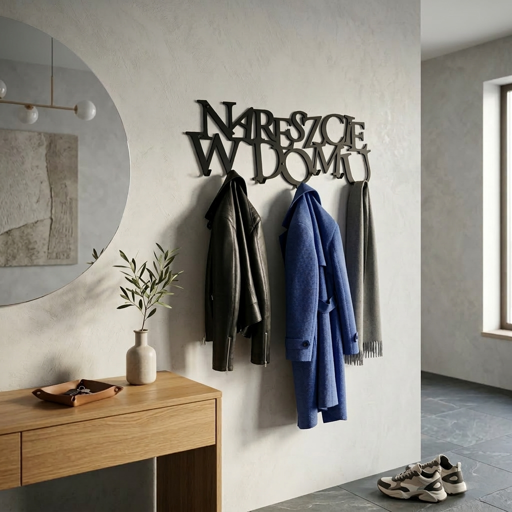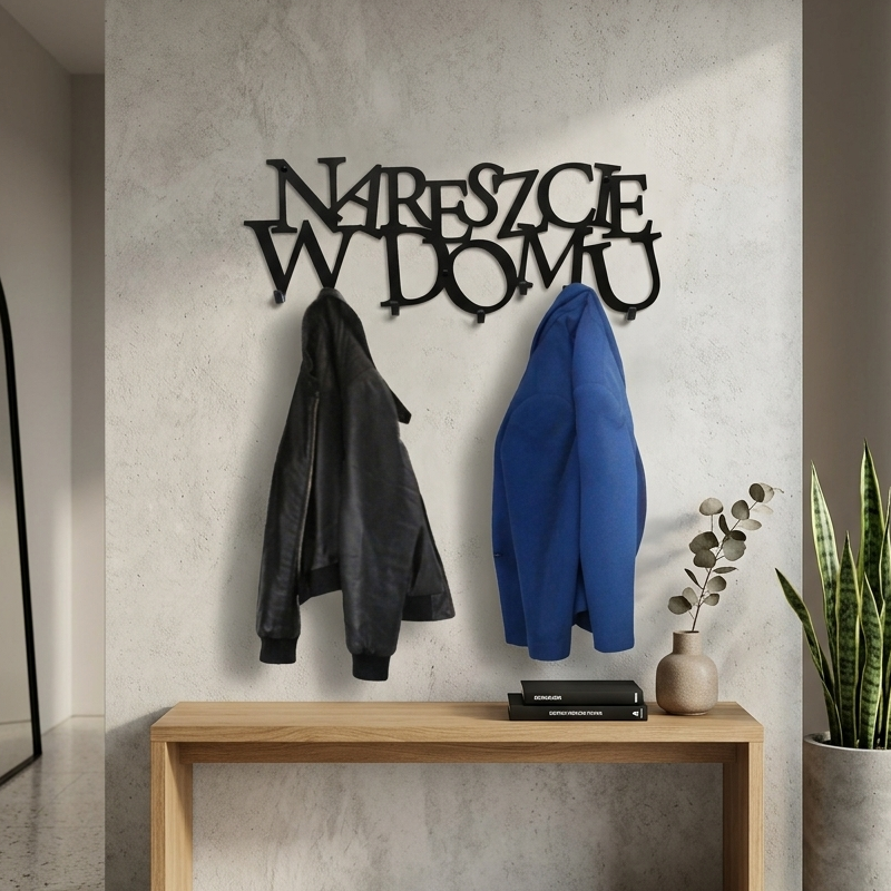 Wieszak na ubrania Nareszcie w domu to wycinany laserowo z metalu to elegancki i trwały dodatek do każdego pomieszczenia. Wysoka jakość materiałów gwarantuje, że wieszak jest odporny na uszkodzenia i zarysowania. Dzięki mocnym haczykom jest idealny do przechowywania ciężkich ubrań i dodatków jak kurtki, płaszcze, torby czy szaliki. Elegancki i minimalistyczny design doskonale wpasuje się w każdą aranżację wnętrza. Znajomi będą nim zachwyceni – sprawdzone niejednokrotnie wśród naszych klientów.