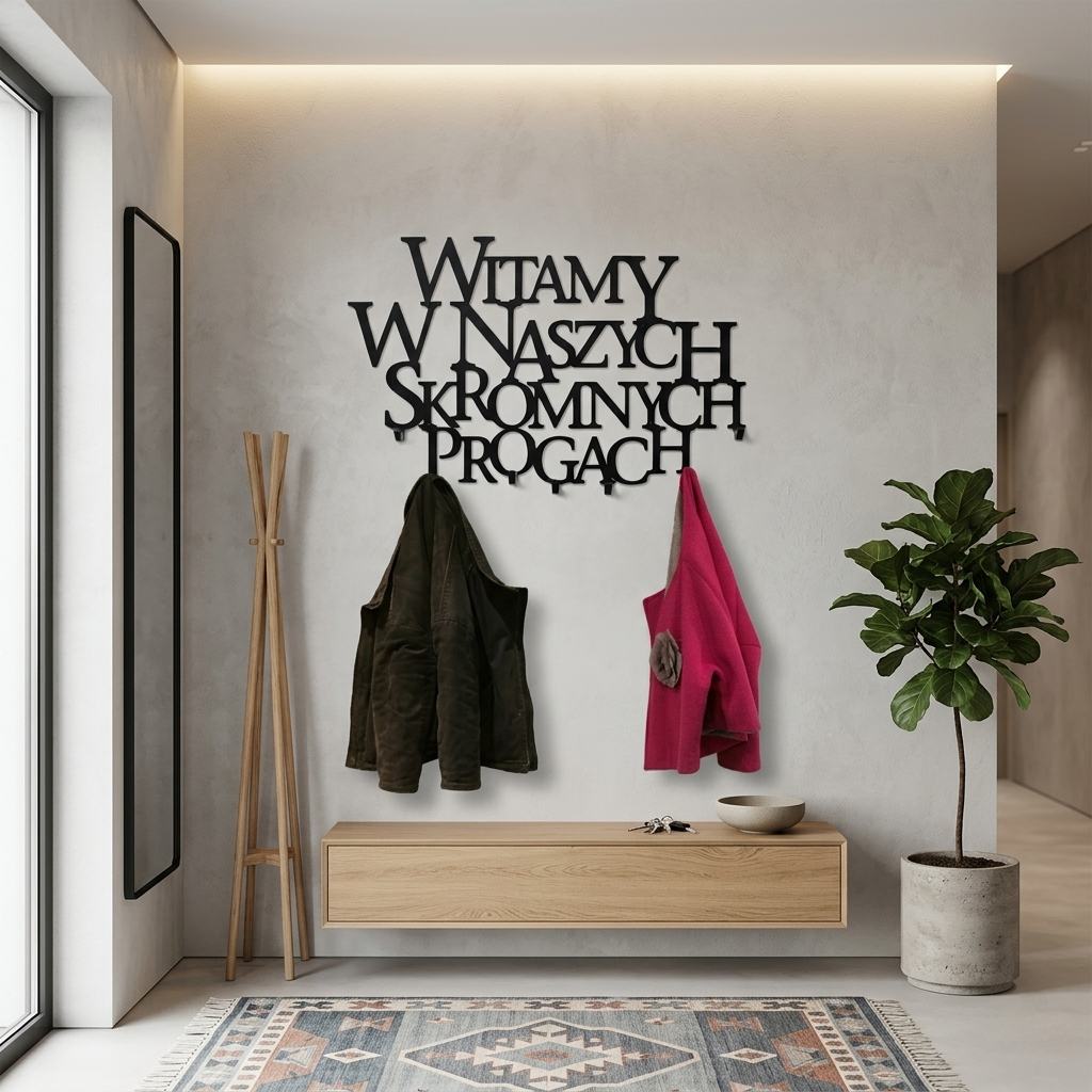Wieszak na ubrania Witamy w naszych skromnych progach to wycinany laserowo z metalu to elegancki i trwały dodatek do każdego pomieszczenia. Wysoka jakość materiałów gwarantuje, że wieszak jest odporny na uszkodzenia i zarysowania. Dzięki mocnym haczykom jest idealny do przechowywania ciężkich ubrań i dodatków jak kurtki, płaszcze, torby czy szaliki. Elegancki i minimalistyczny design doskonale wpasuje się w każdą aranżację wnętrza. Znajomi będą nim zachwyceni – sprawdzone niejednokrotnie wśród naszych klientów.