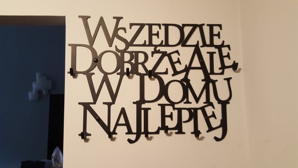 Wieszak na ubrania Wszędzie dobrze ale w domu najlepiej to wycinany laserowo z metalu to elegancki i trwały dodatek do każdego pomieszczenia. Wysoka jakość materiałów gwarantuje, że wieszak jest odporny na uszkodzenia i zarysowania. Dzięki mocnym haczykom jest idealny do przechowywania ciężkich ubrań i dodatków jak kurtki, płaszcze, torby czy szaliki. Elegancki i minimalistyczny design doskonale wpasuje się w każdą aranżację wnętrza. Znajomi będą nim zachwyceni – sprawdzone niejednokrotnie wśród naszych klientów.